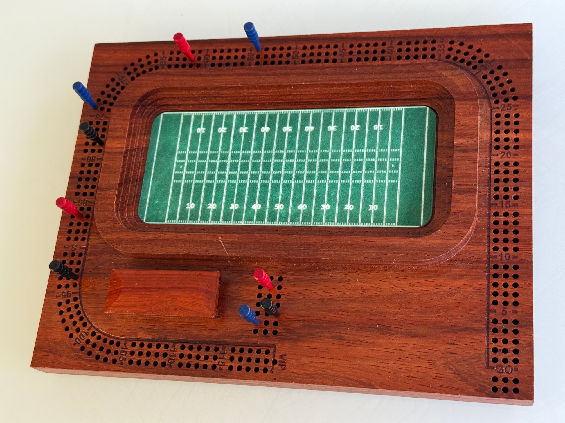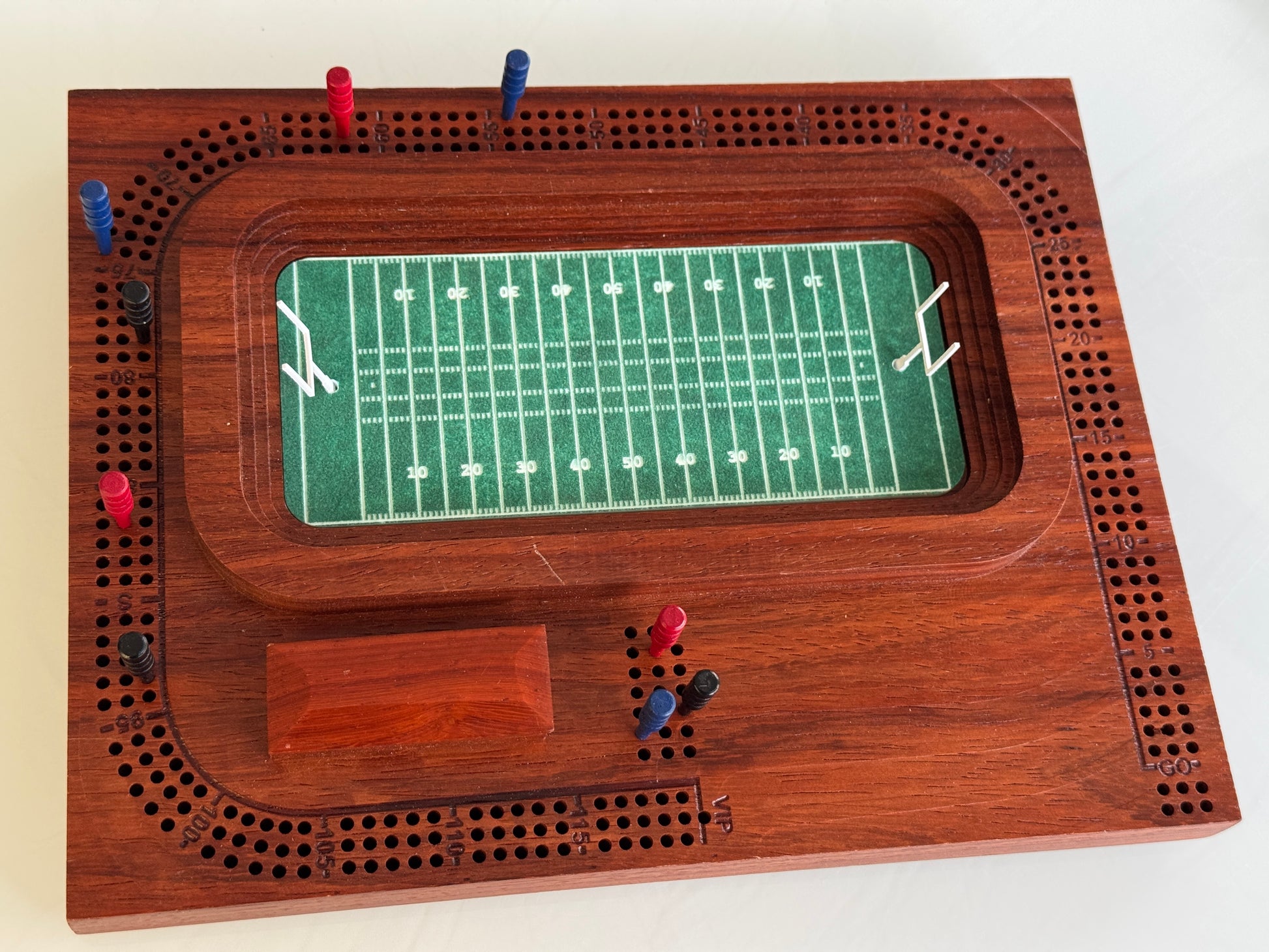 Carved, solid 3-track cribbage board in an Football stadium theme. Includes cork feet, a slotted back for wall mounting and 9 wooden crib pegs stored in the clubhouse.