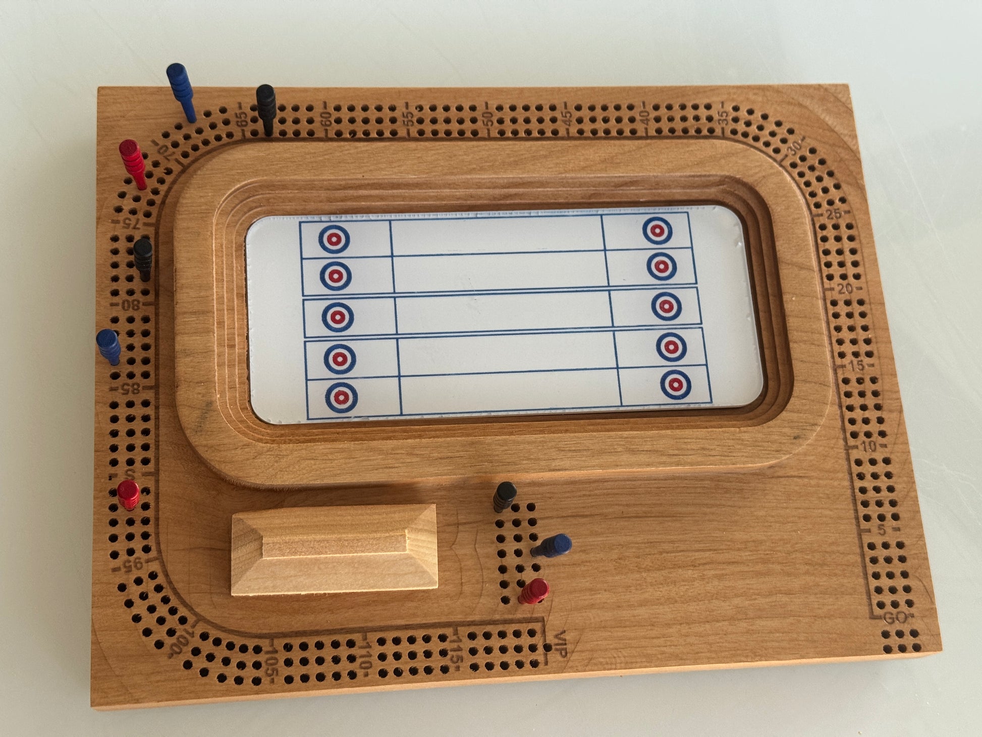 Carved, solid 3-track cribbage board in a Curling Rink / Arena theme. Includes cork feet, a slotted back for wall mounting and 9 wooden crib pegs stored in the clubhouse.