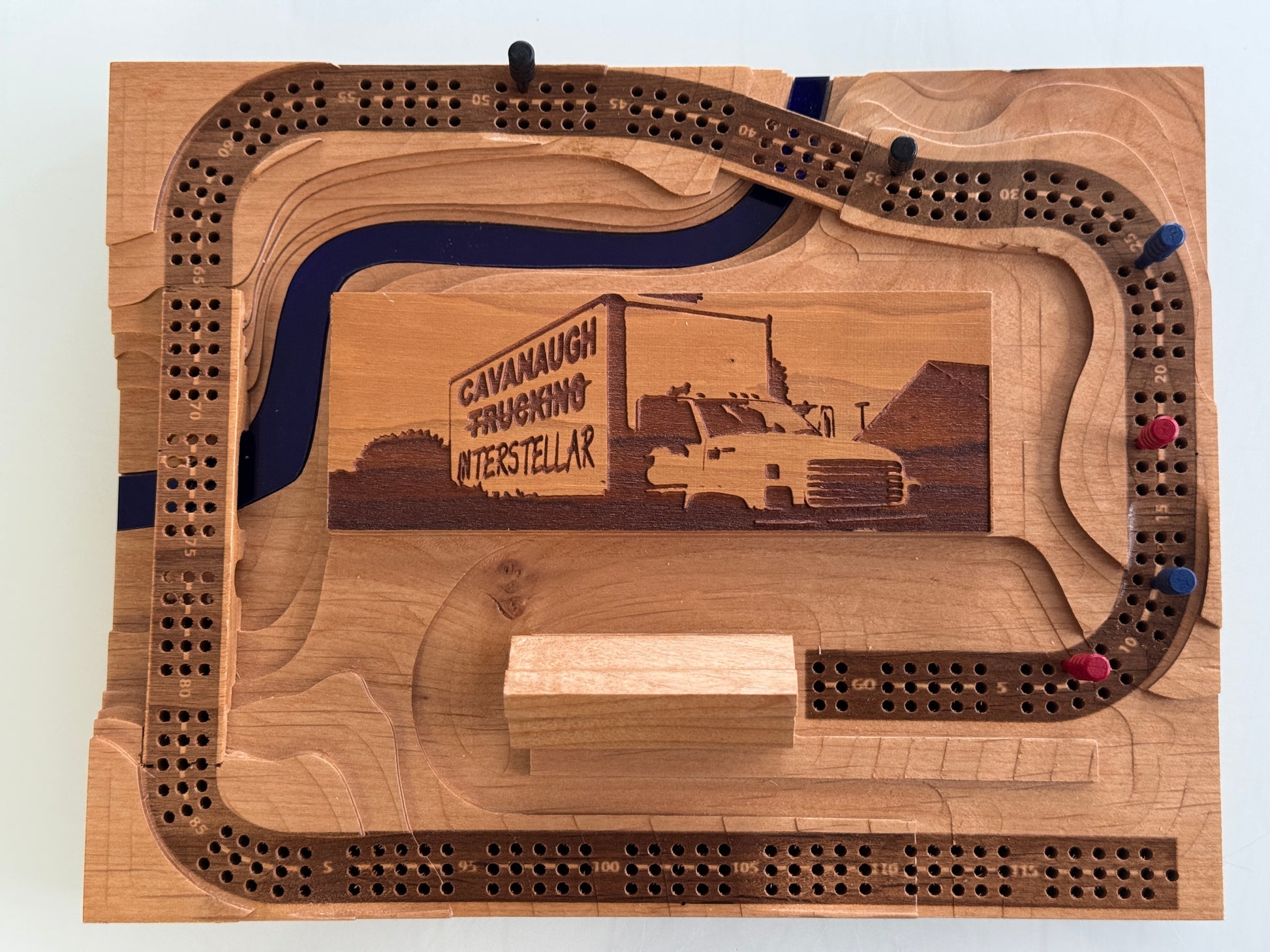 Your cribbage game will take you from the central board area along a winding path that slowly climbs and loops to cross over the river. Traveling onward, you will ride the ridges and valleys until you cross a viaduct over a raging river that signals the beginning of your descent to the plains below, ready for your next adventure.