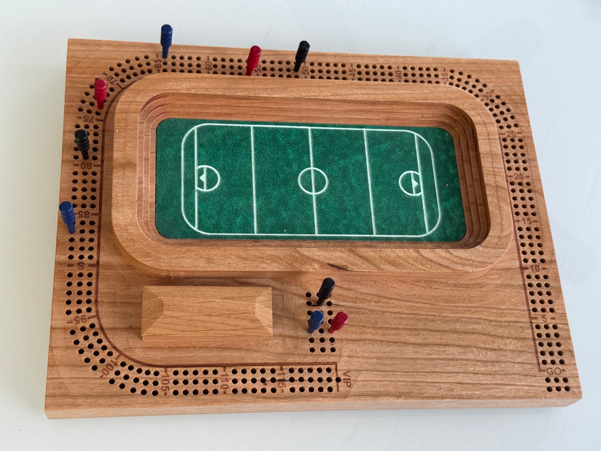 Carved, solid 3-track cribbage board in an Lacrosse stadium theme. Includes cork feet, a slotted back for wall mounting and 9 wooden crib pegs stored in the clubhouse.