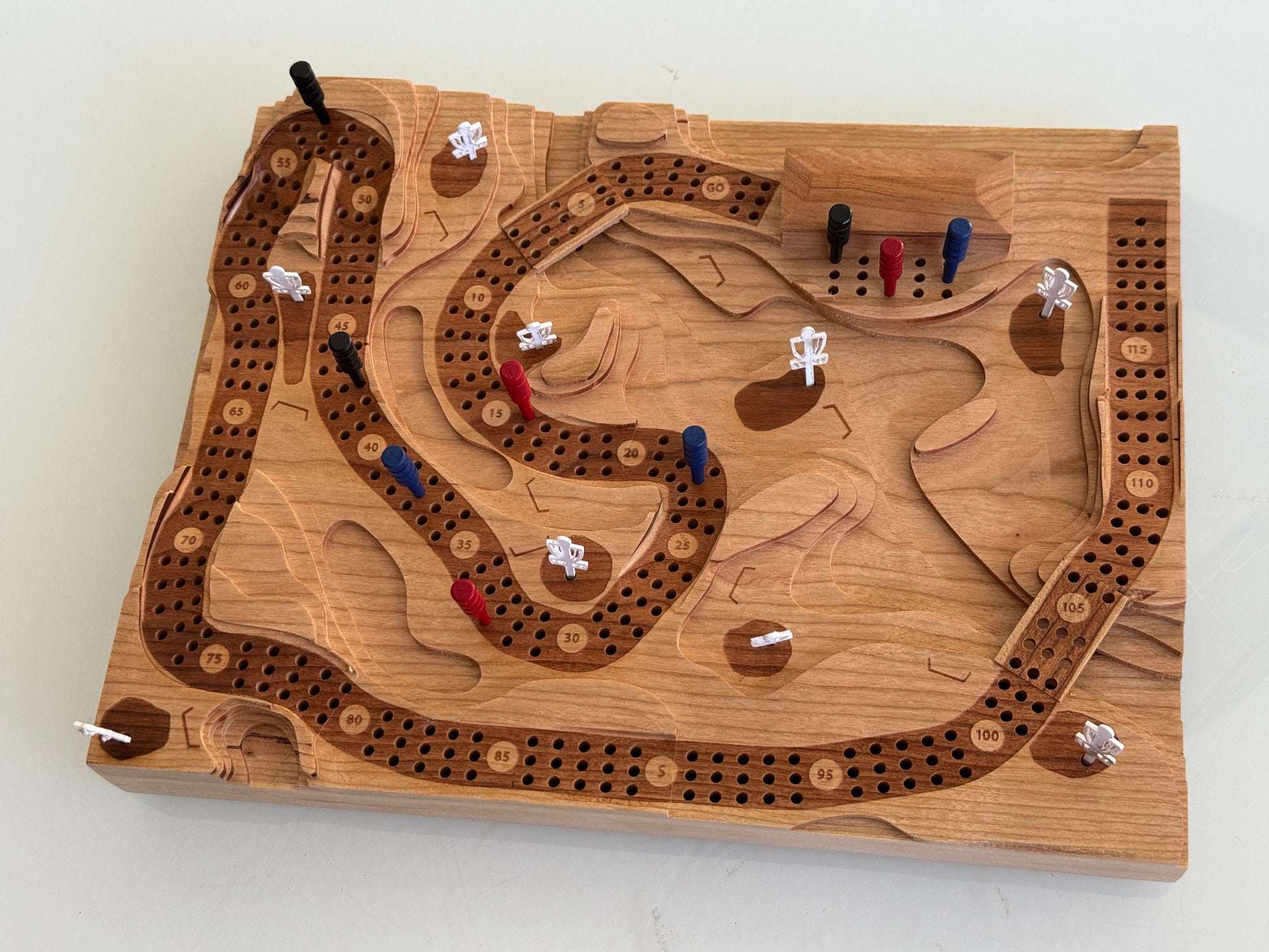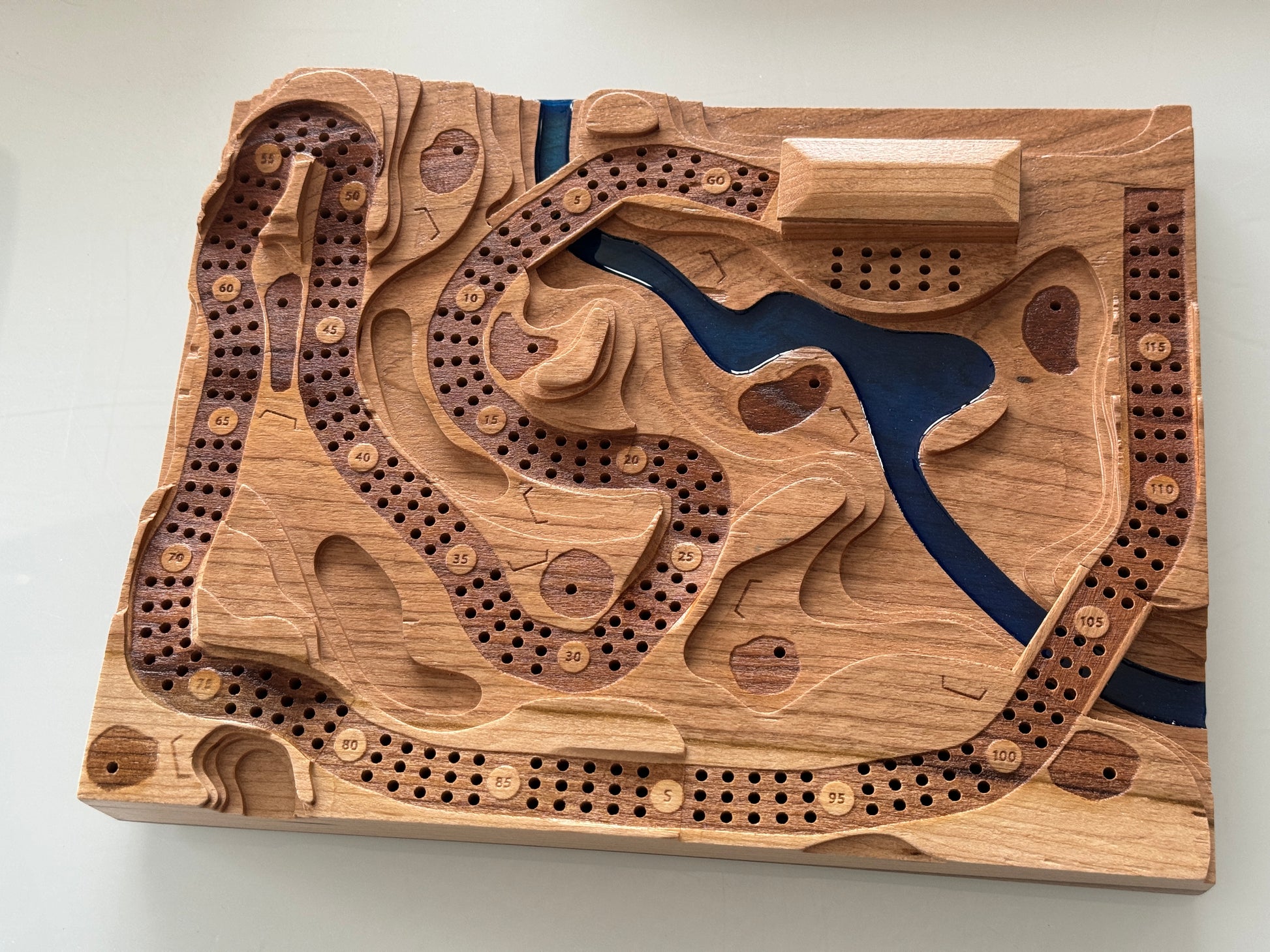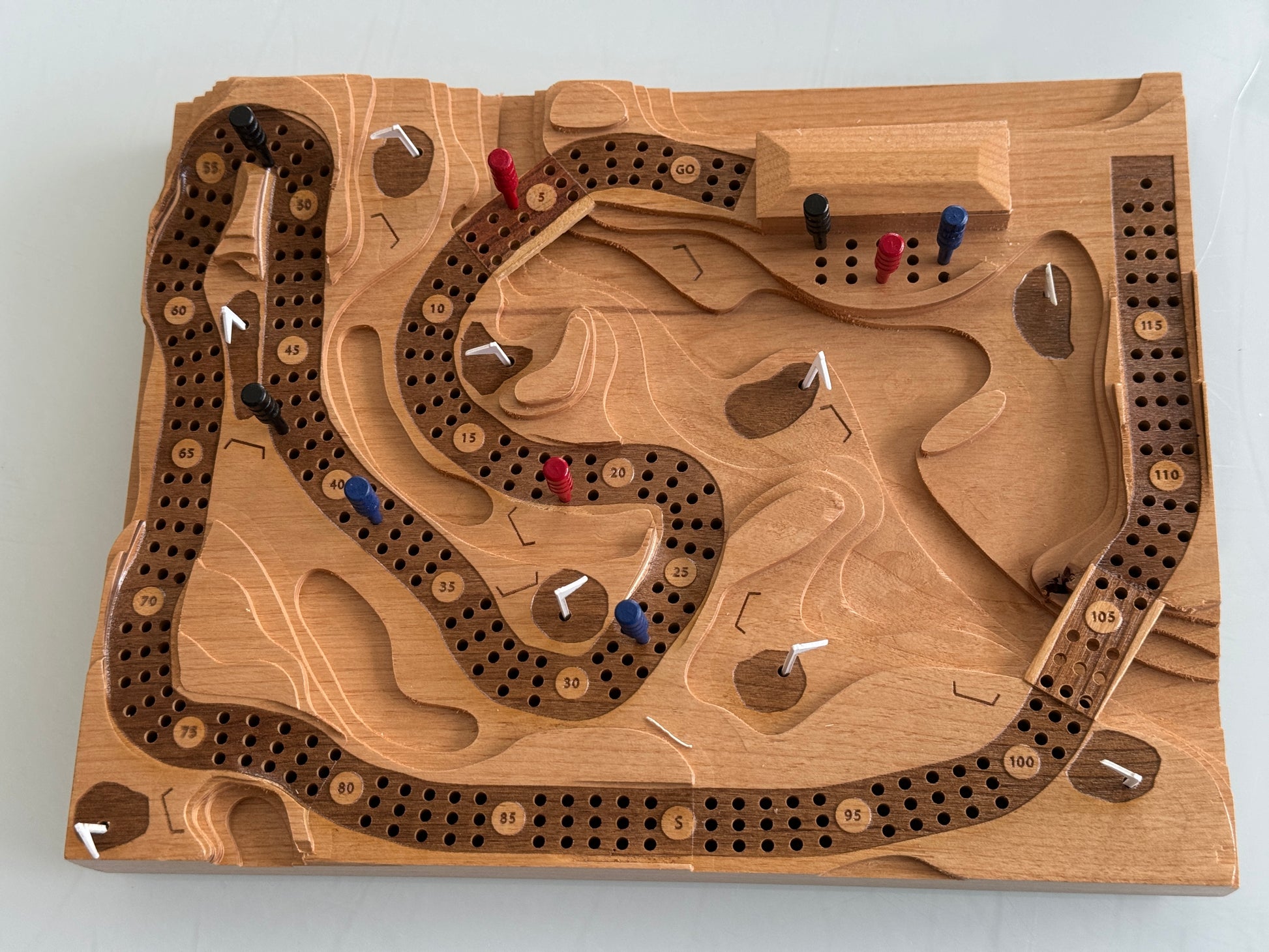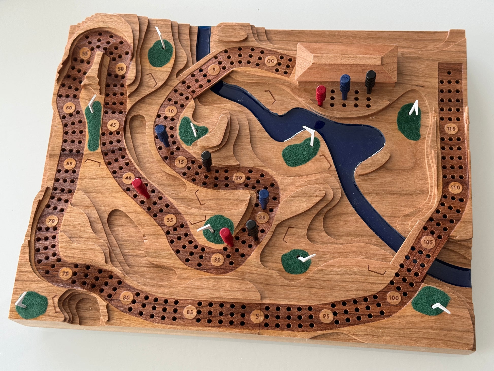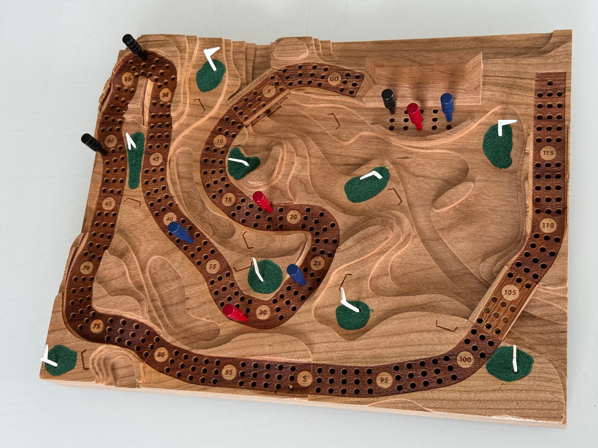 Your cribbage board offers a trek around the 'Back Nine' of an artfully landscaped golf course. If you can find a way to actually play the golf game, there are tee boxes, greens and pin flags and holes for each of the nine holes. If you are only playing cribbage, you will have to let your imagination take care of the golfing. Either way, park your cart at the clubhouse at the end of the game, and have a sit on the patio overlooking the course, planning your next round.