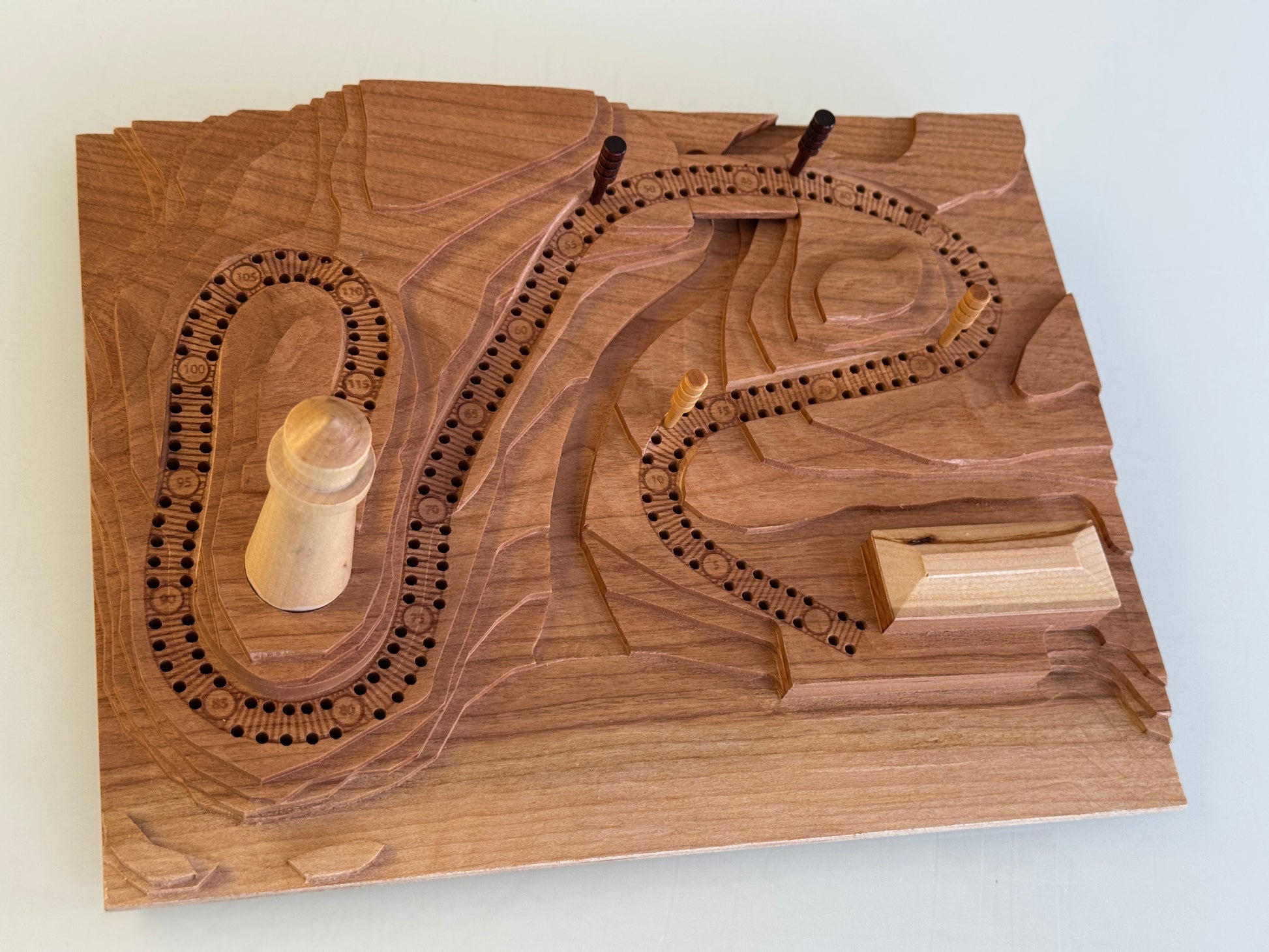 Carved, solid 2-track cribbage board in a seashore/lighthouse theme. Includes cork feet, a slotted back for wall mounting and wooden crib pegs stored in the boathouse.