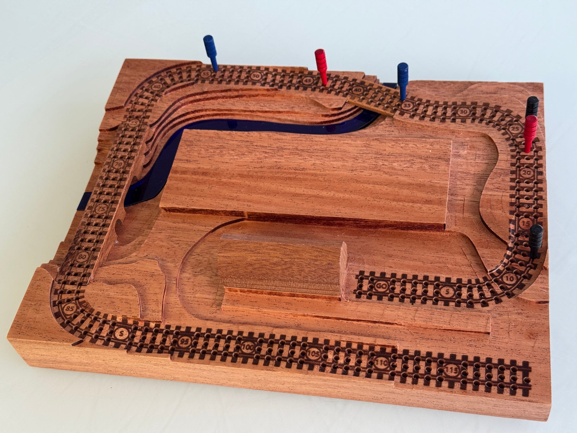 Carved, solid 3-track cribbage board in a railroad theme. Includes cork feet, a slotted back for wall mounting and 6 wooden crib pegs stored in the station.