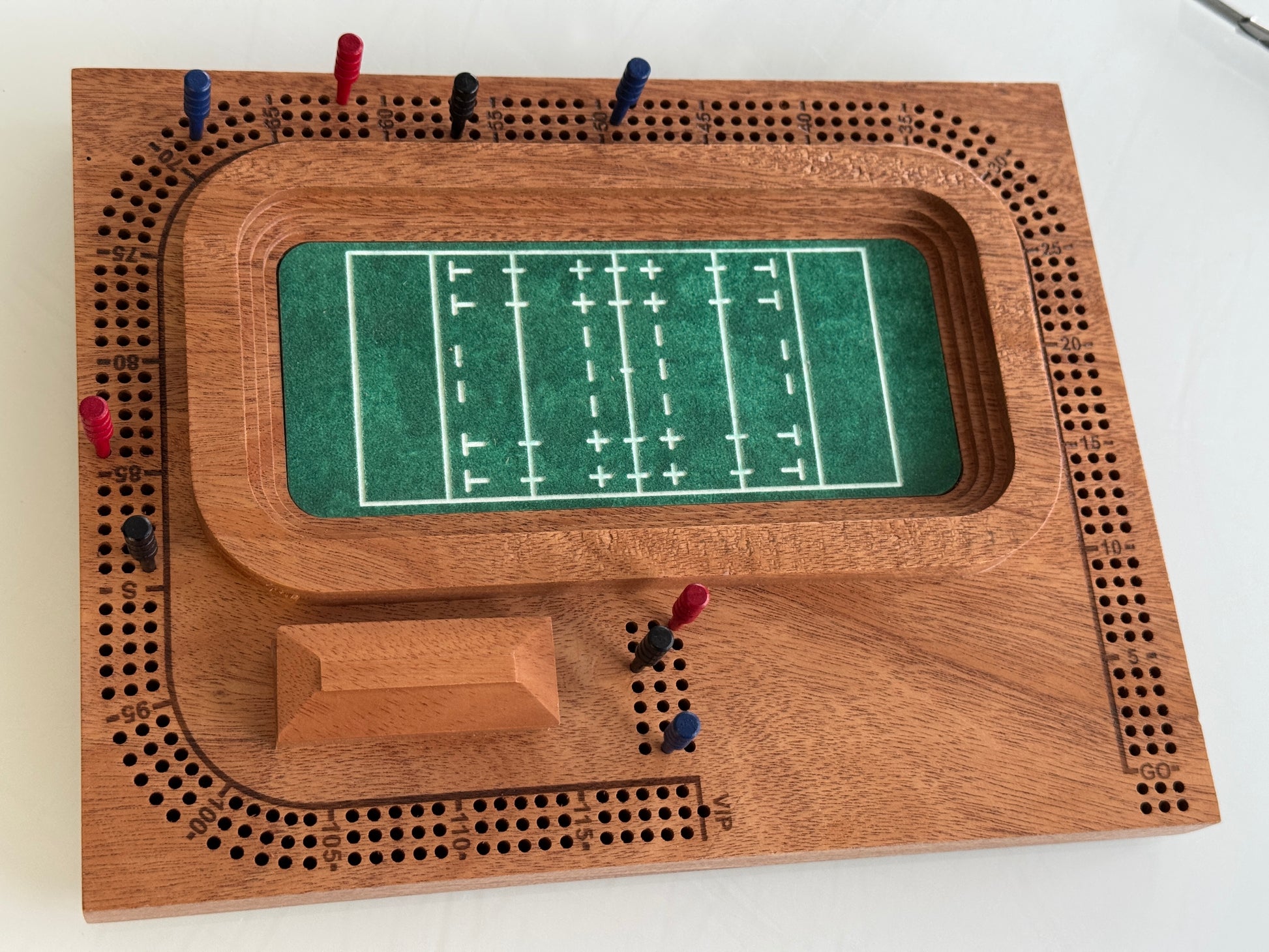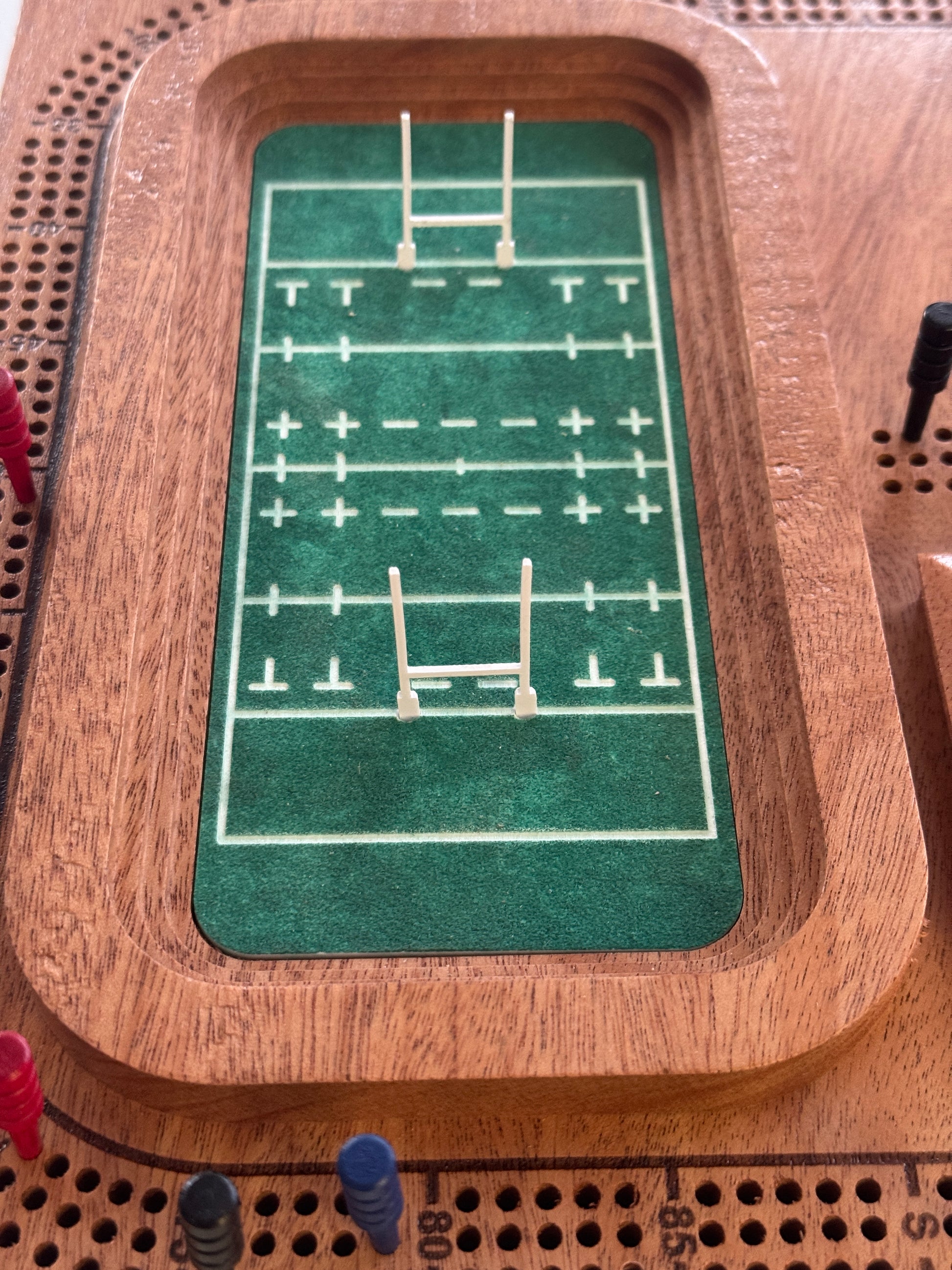 Carved, solid 3-track cribbage board in a Rugby stadium theme. Includes cork feet, a slotted back for wall mounting and 9 wooden crib pegs stored in the clubhouse.
