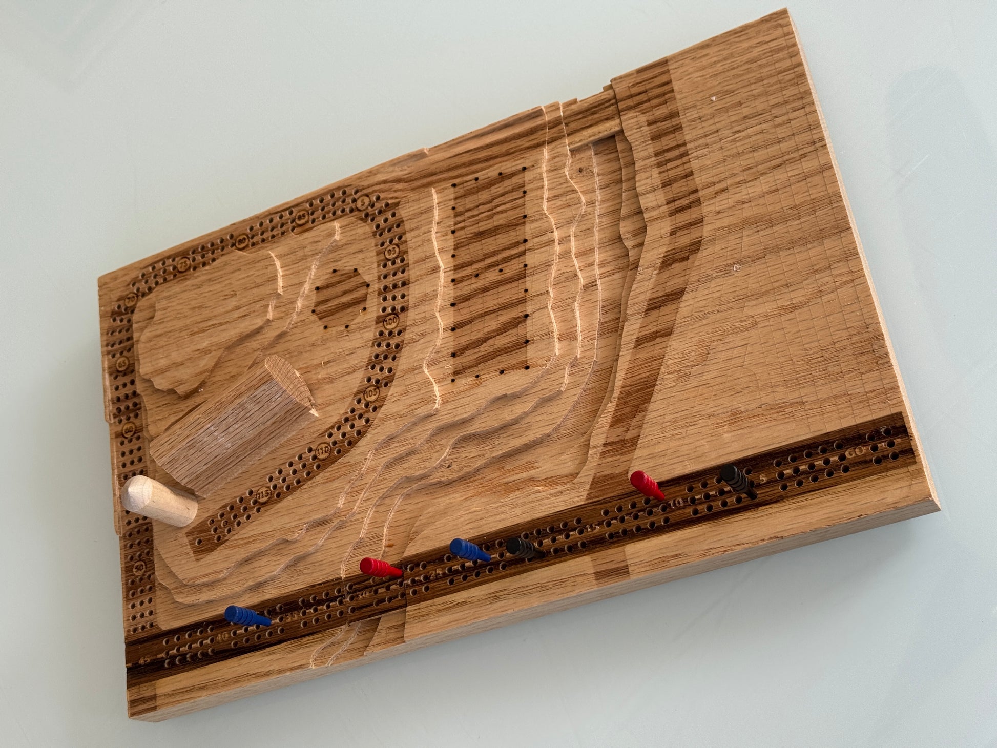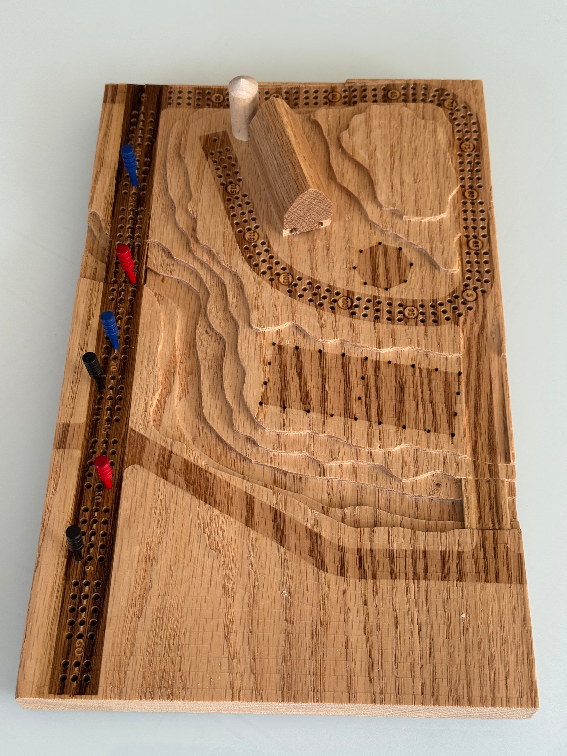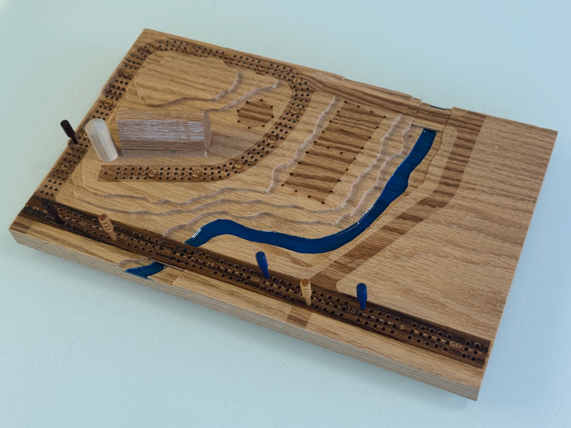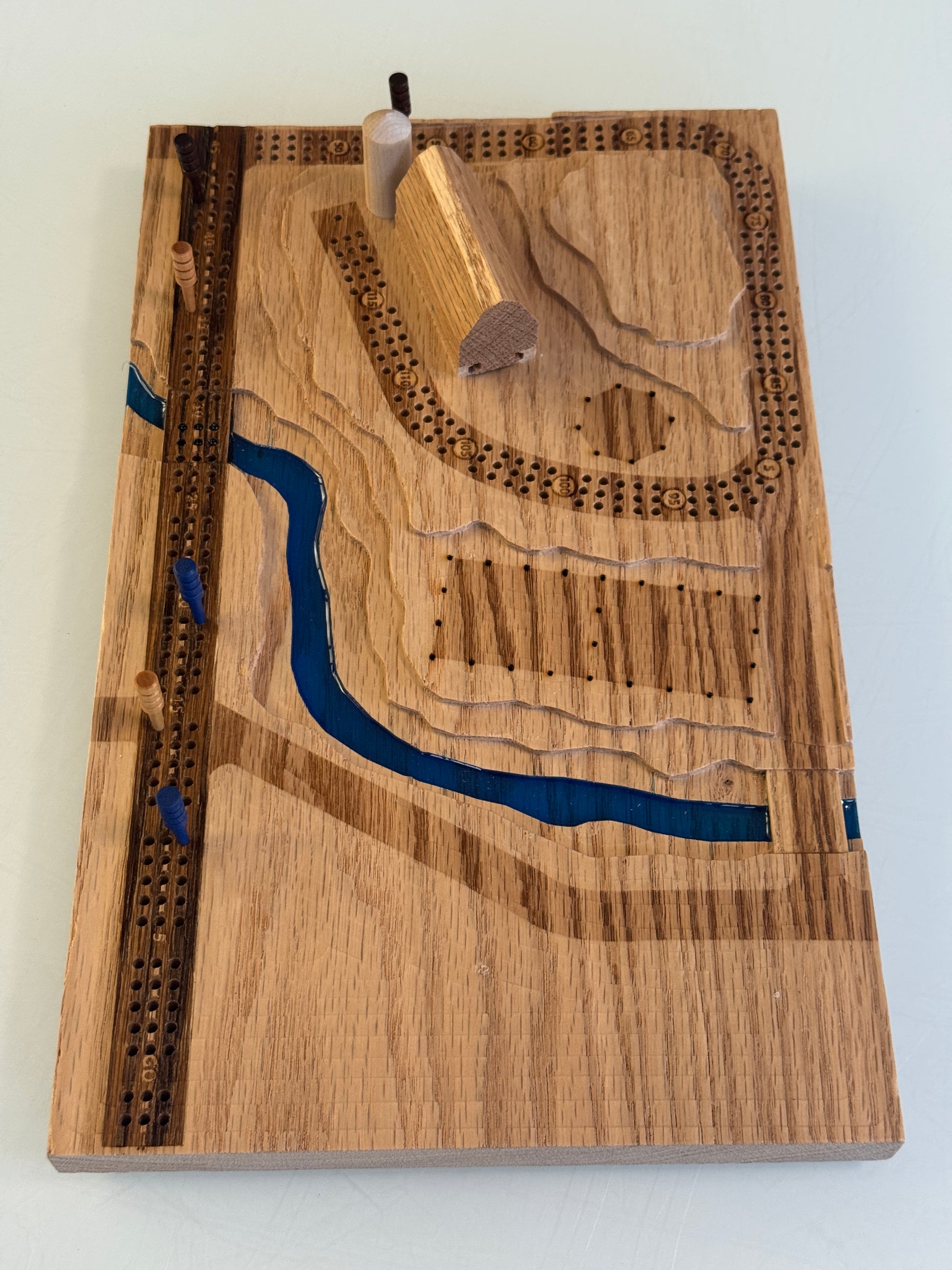 Carved, solid 3-track cribbage board in a Farm / Ranch theme. Includes cork feet, a slotted back for wall mounting and 6 wooden crib pegs stored in the barn.