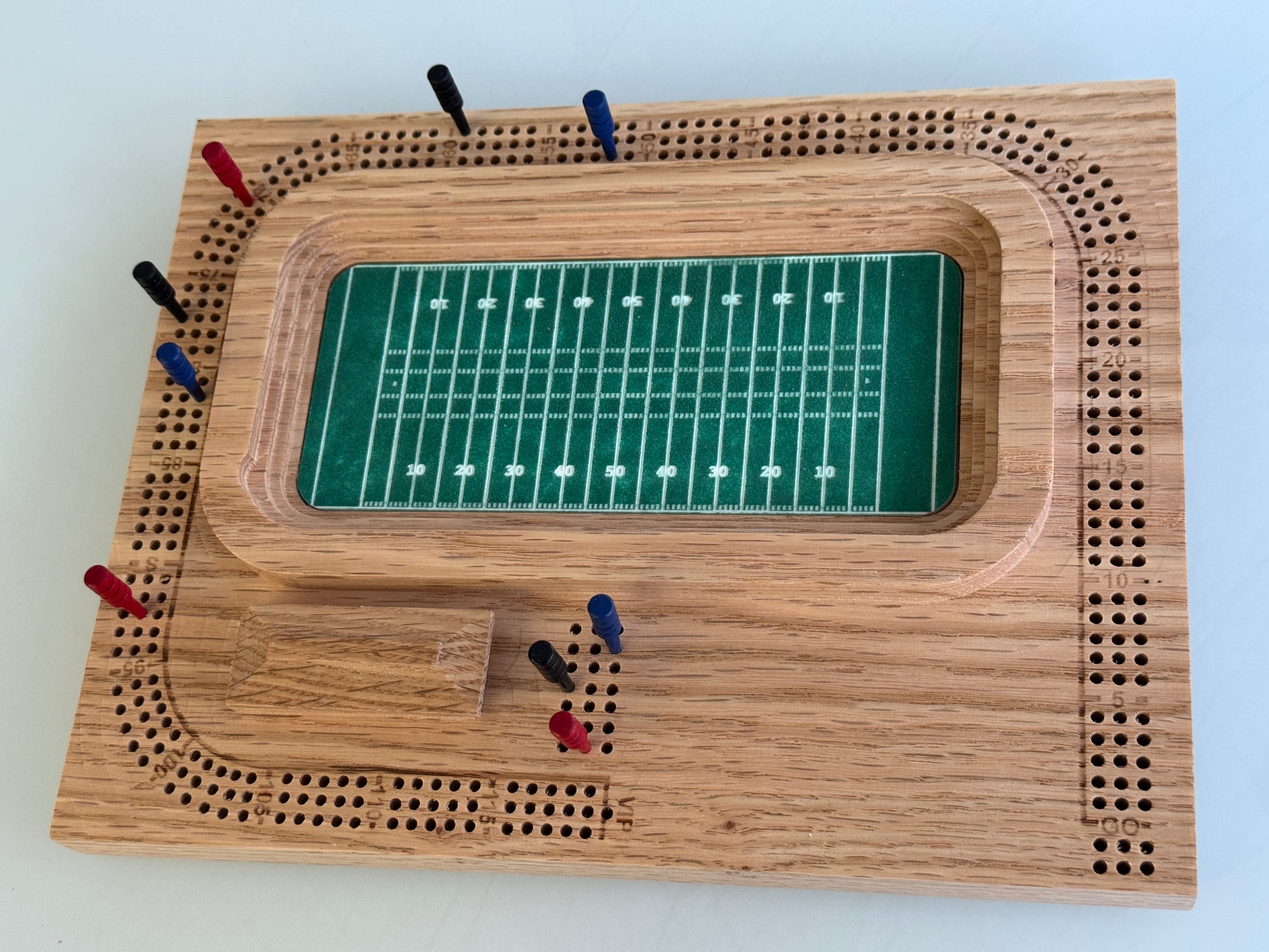 Carved, solid 3-track cribbage board in a Football stadium theme. Includes cork feet, a slotted back for wall mounting and 9 wooden crib pegs stored in the clubhouse.