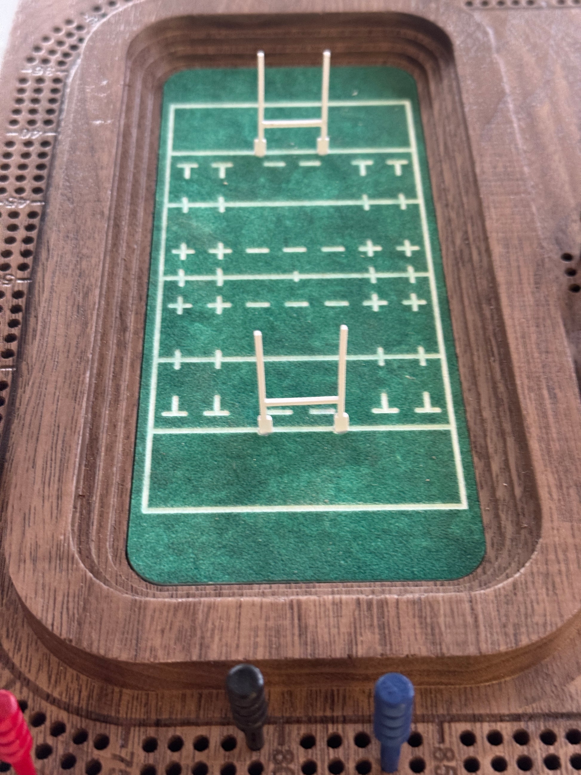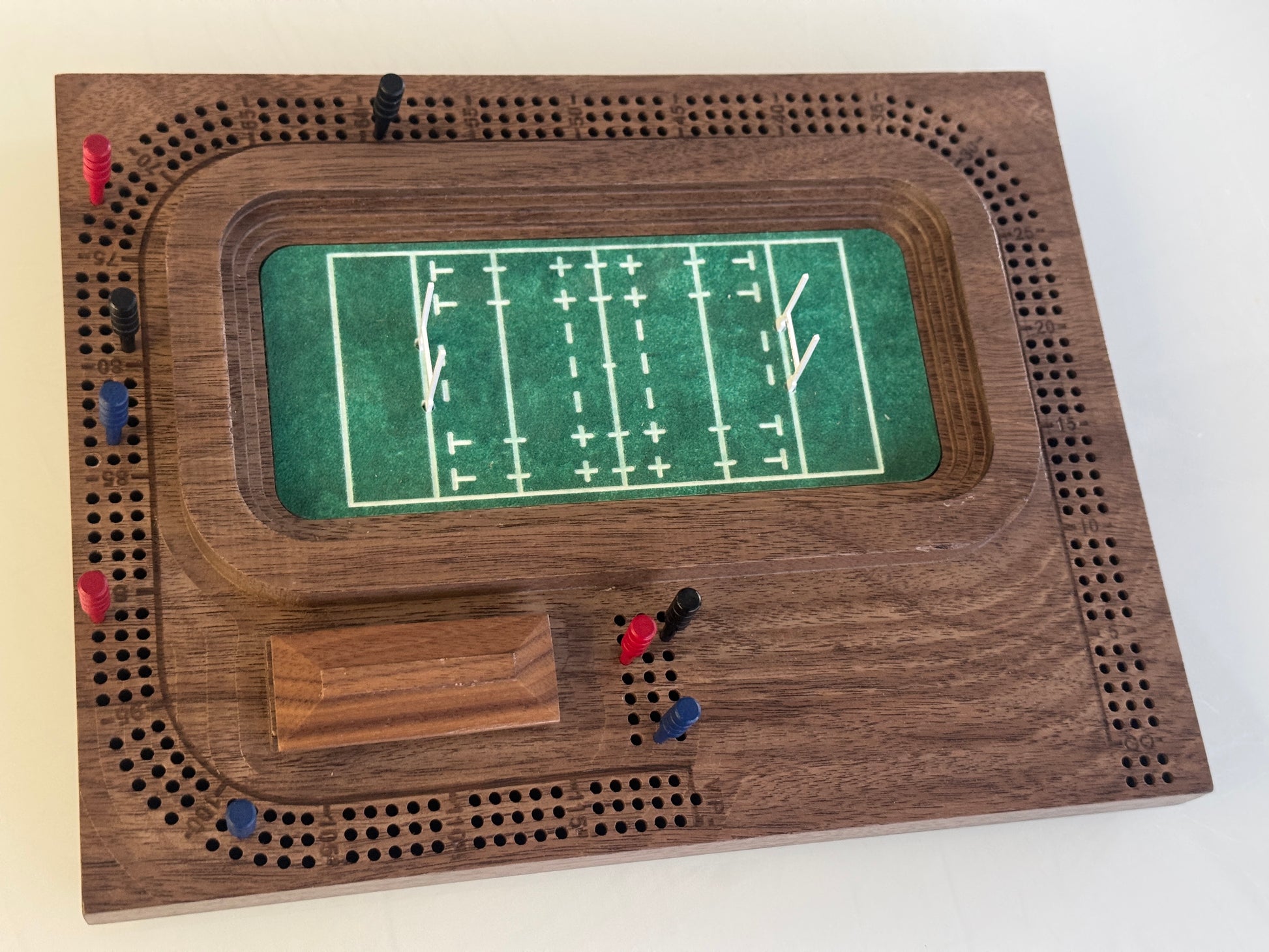 Carved, solid 3-track cribbage board in a Rugby stadium theme. Includes cork feet, a slotted back for wall mounting and 9 wooden crib pegs stored in the clubhouse.