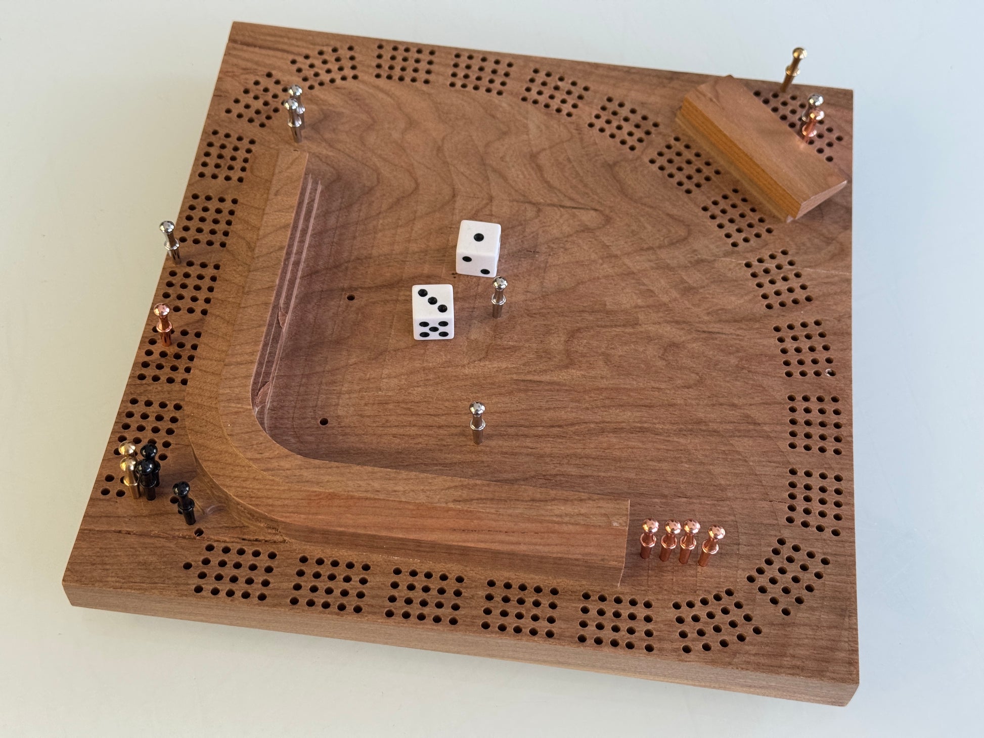 Carved, solid hardwood 4-track cribbage board in a baseball diamond theme. Includes cork feet, a slotted back for wall mounting and 12 metal crib pegs stored in the clubhouse. This one is a Dice Baseball Board!