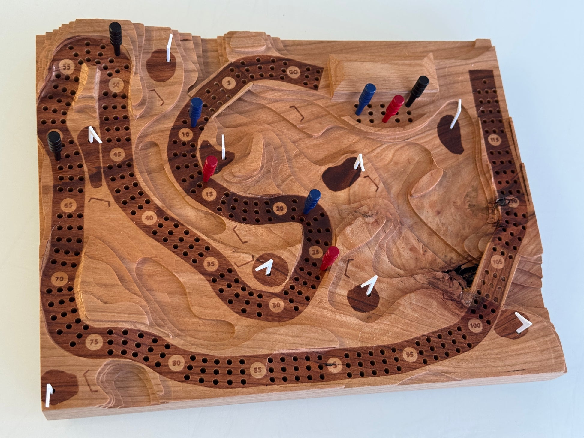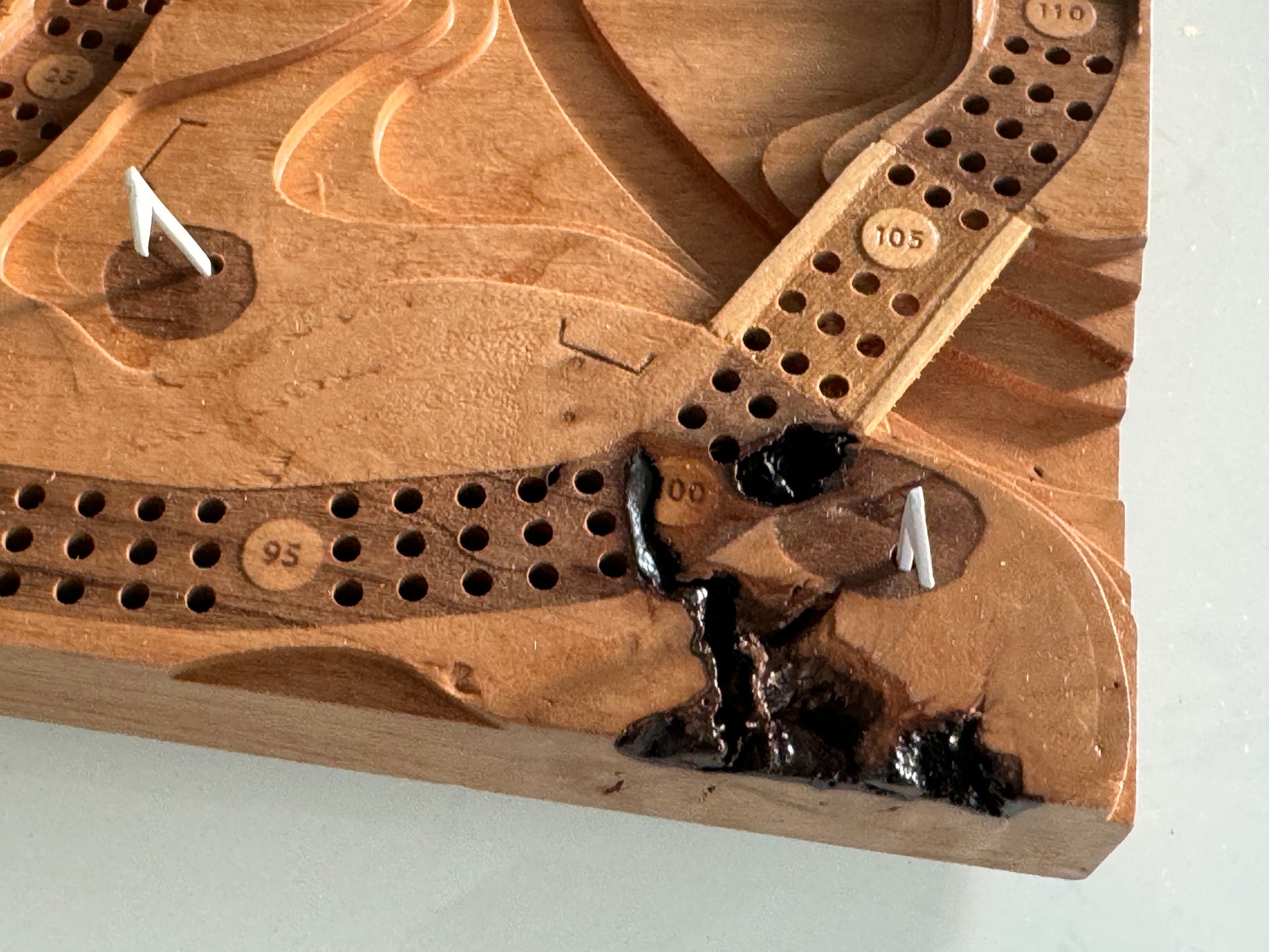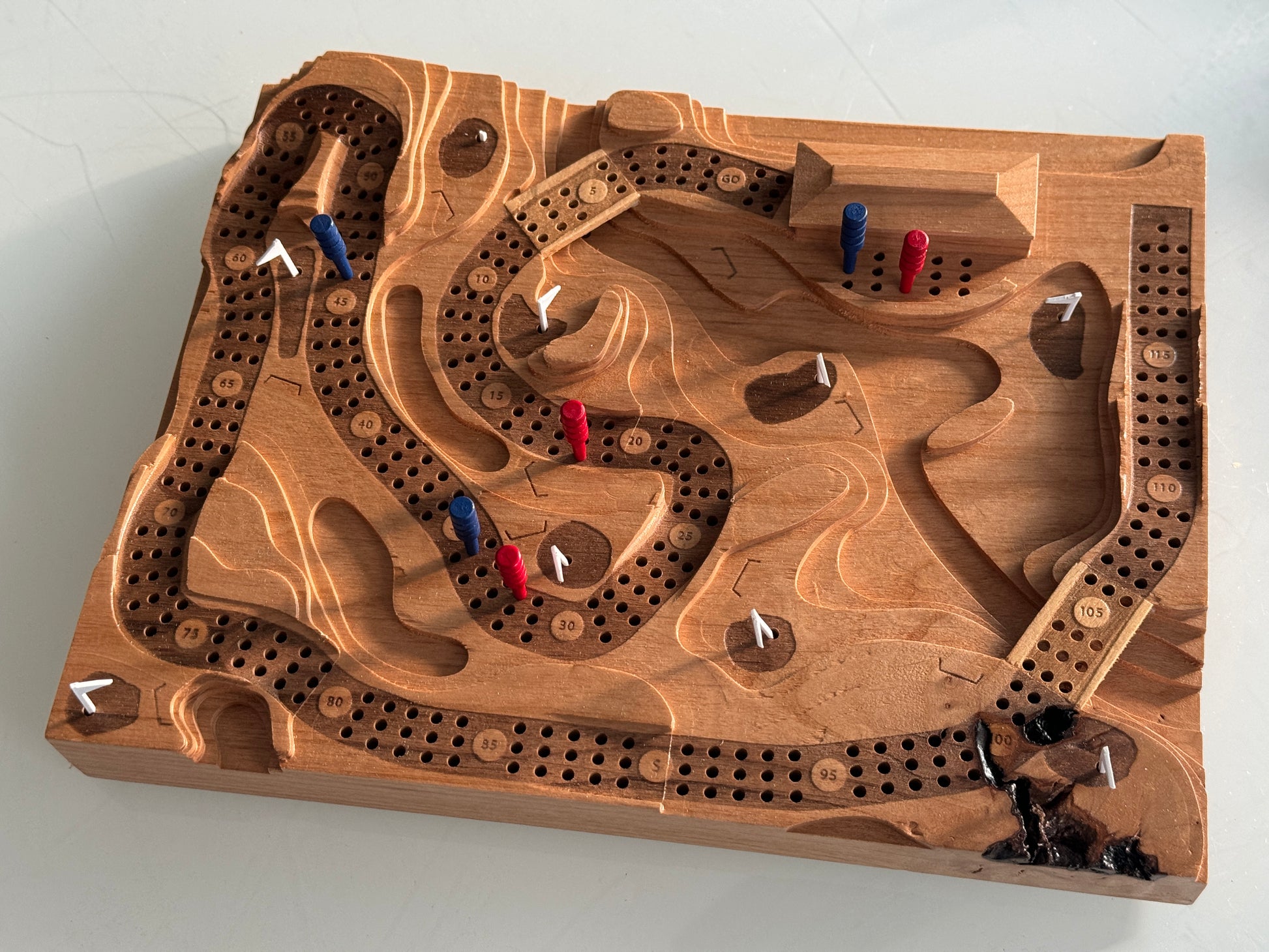 Your cribbage board offers a trek around the 'Back Nine' of an artfully landscaped golf course. If you can find a way to actually play the golf game, there are tee boxes, greens and pin flags and holes for each of the nine holes. If you are only playing cribbage, you will have to let your imagination take care of the golfing. Either way, park your cart at the clubhouse at the end of the game, and have a sit on the patio overlooking the course, planning your next round.