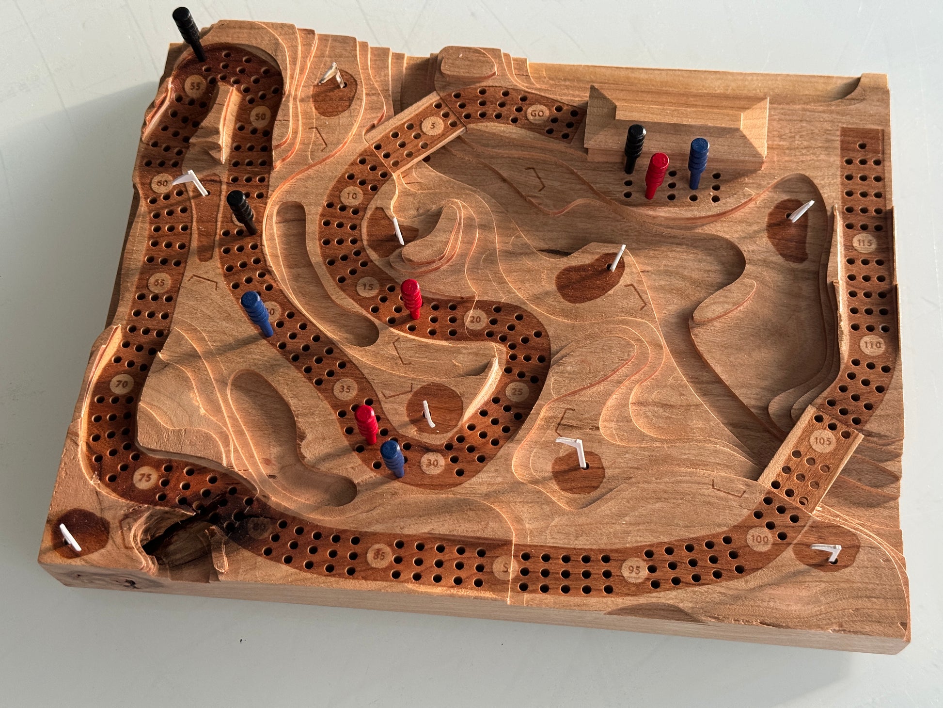 Your cribbage board offers a trek around the 'Back Nine' of an artfully landscaped golf course. If you can find a way to actually play the golf game, there are tee boxes, greens and pin flags and holes for each of the nine holes. If you are only playing cribbage, you will have to let your imagination take care of the golfing. Either way, park your cart at the clubhouse at the end of the game, and have a sit on the patio overlooking the course, planning your next round.
