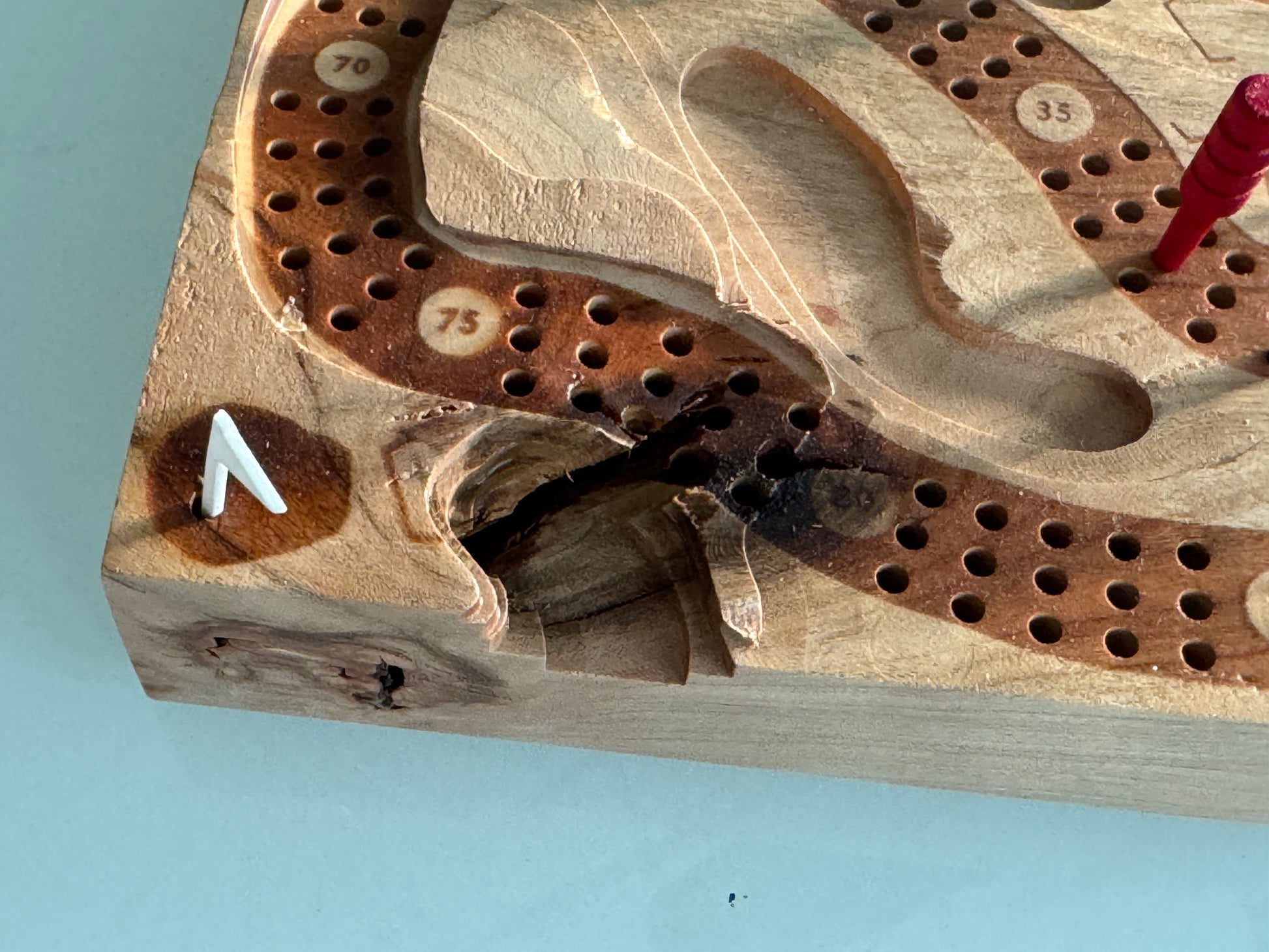 Carved, solid 3-track cribbage board in a golf theme. Includes cork feet, a slotted back for wall mounting and 6 wooden crib pegs stored in the clubhouse.