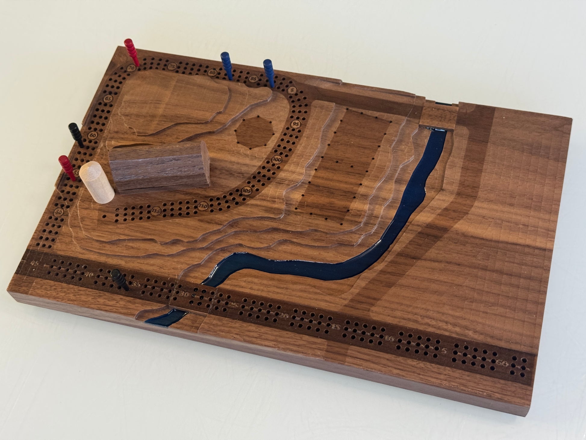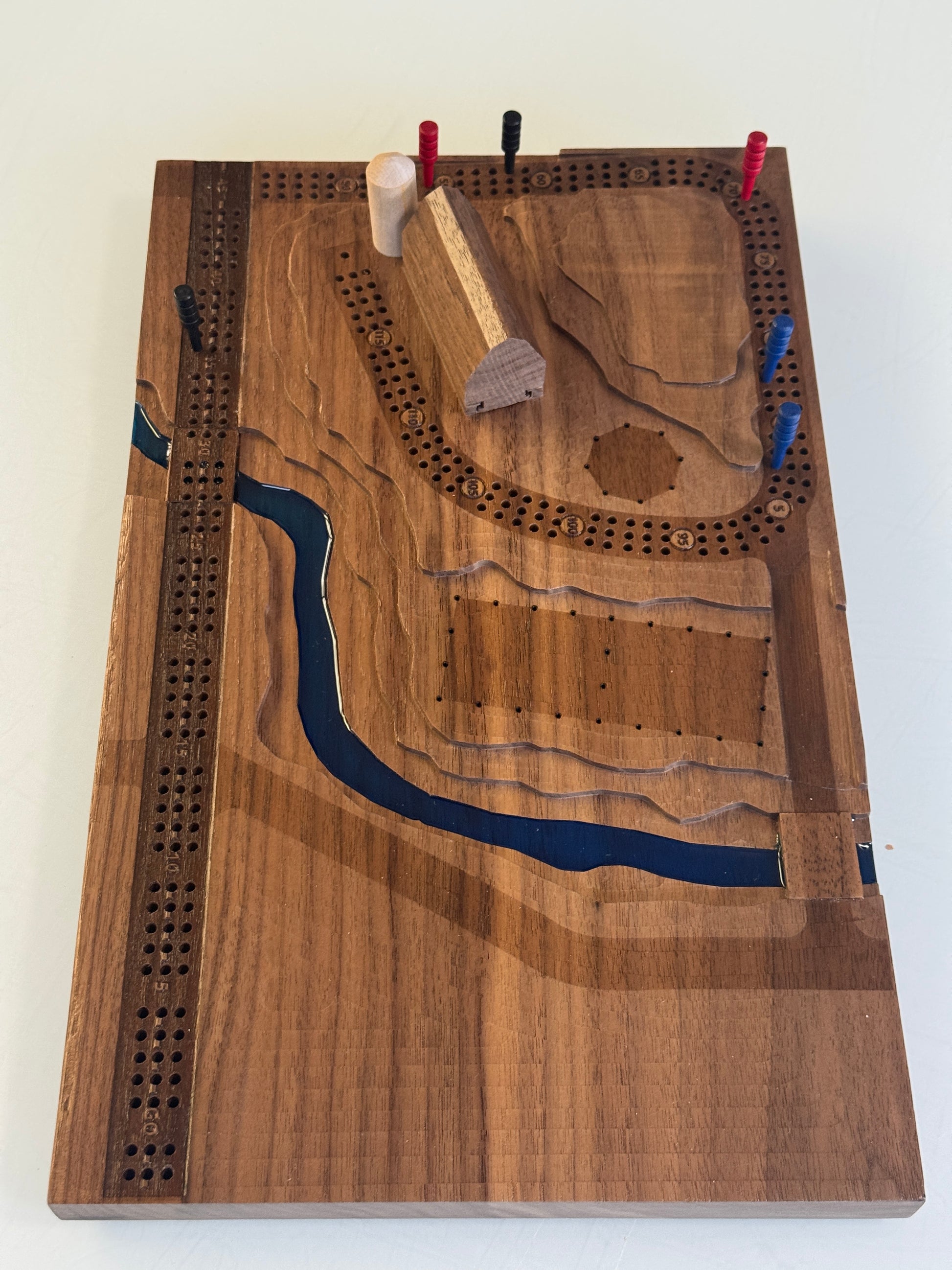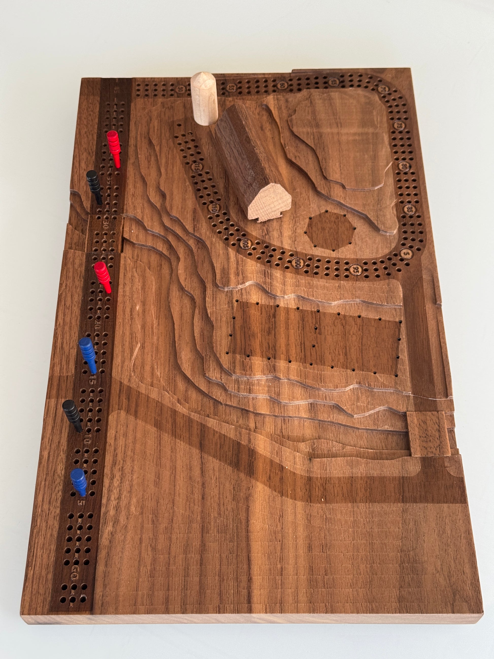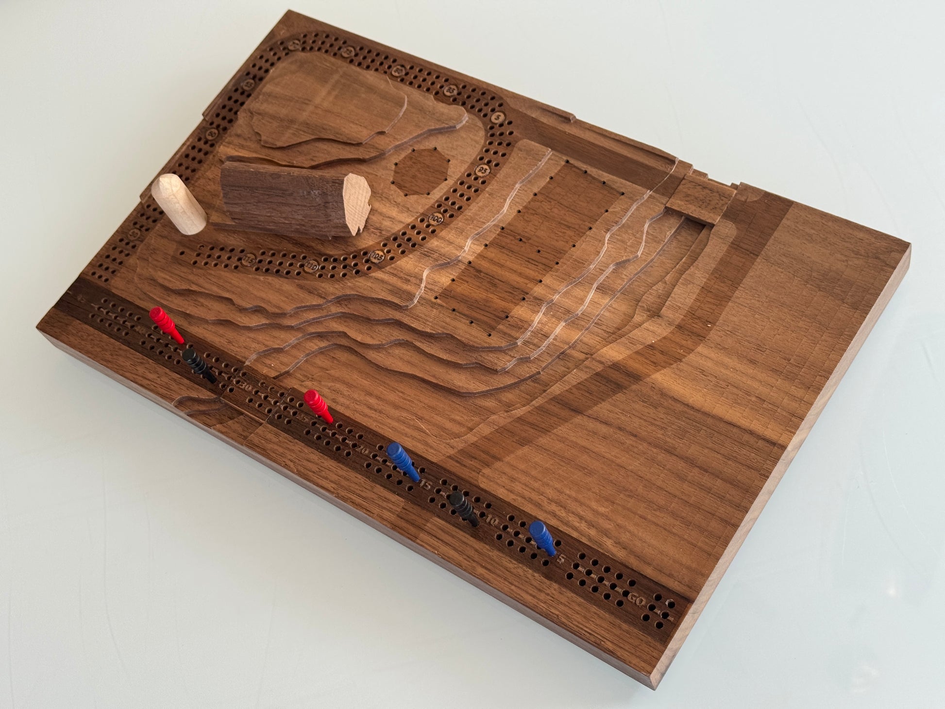 Carved, solid 3-track cribbage board in a Farm / Ranch theme. Includes cork feet, a slotted back for wall mounting and 6 wooden crib pegs stored in the barn.