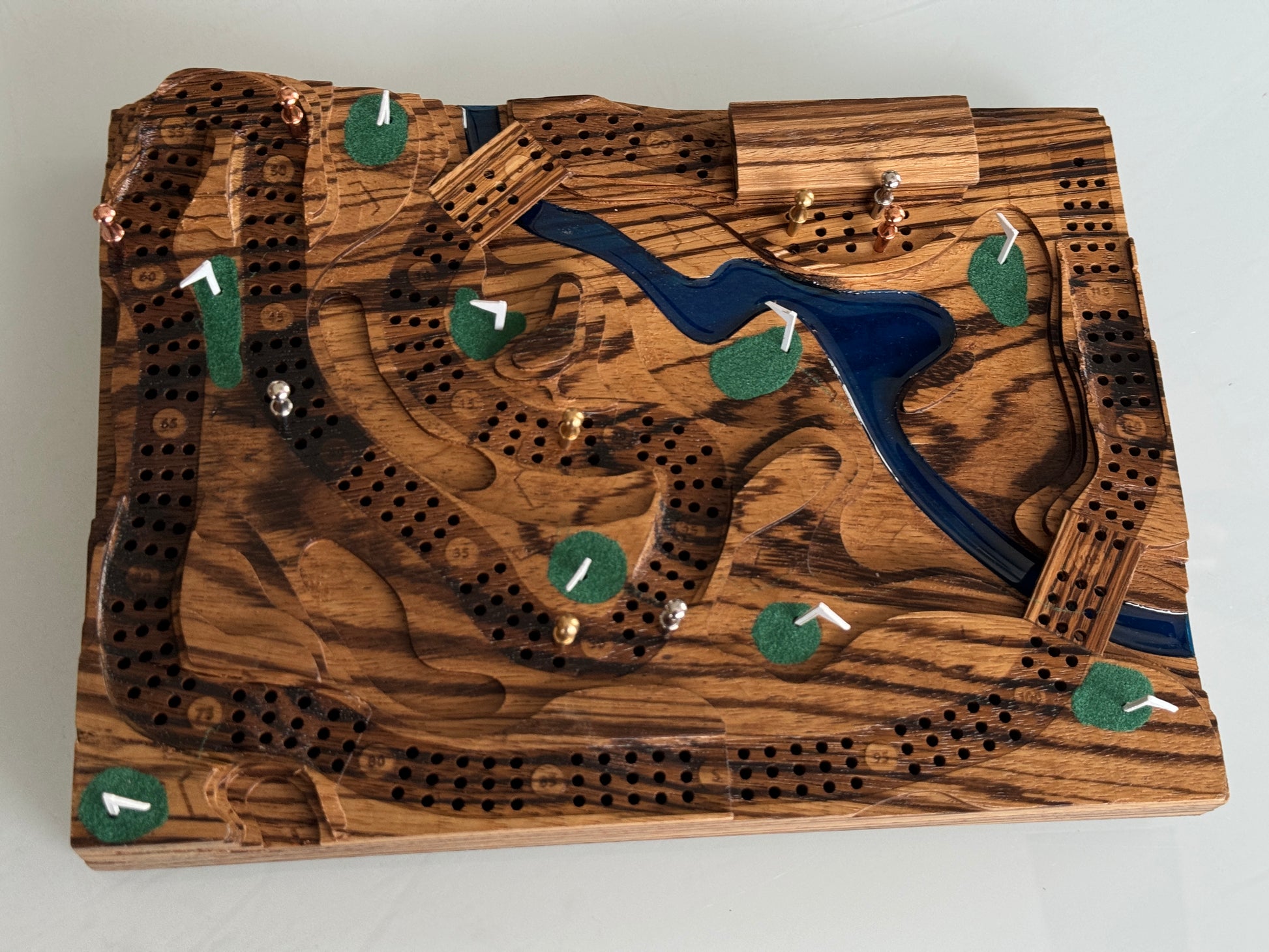 Your cribbage board offers a trek around the 'Back Nine' of an artfully landscaped golf course. If you can find a way to actually play the golf game, there are tee boxes, greens and pin flags and holes for each of the nine holes. If you are only playing cribbage, you will have to let your imagination take care of the golfing. Either way, park your cart at the clubhouse at the end of the game, and have a sit on the patio overlooking the course, planning your next round.